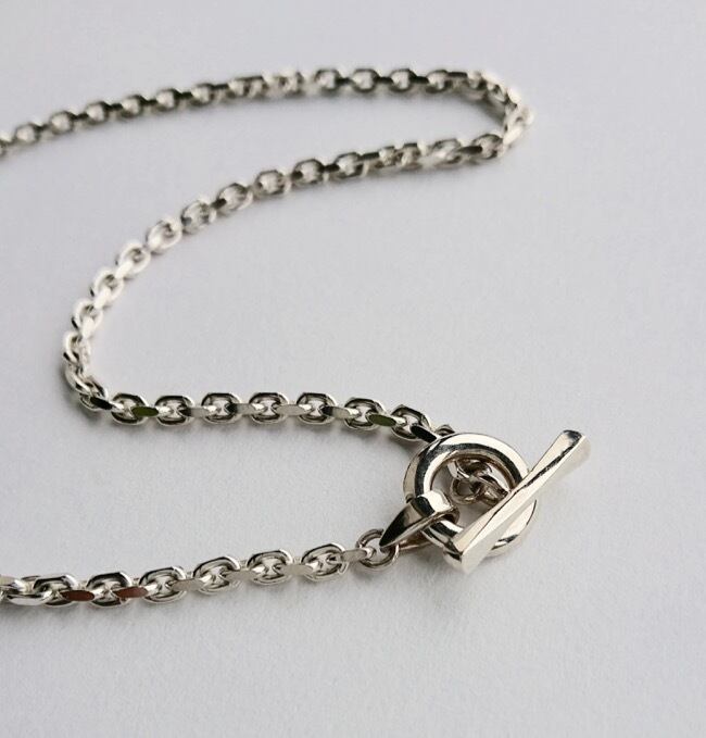 シンプルなトップスに映えるシルバーチェーンのネックレスです。